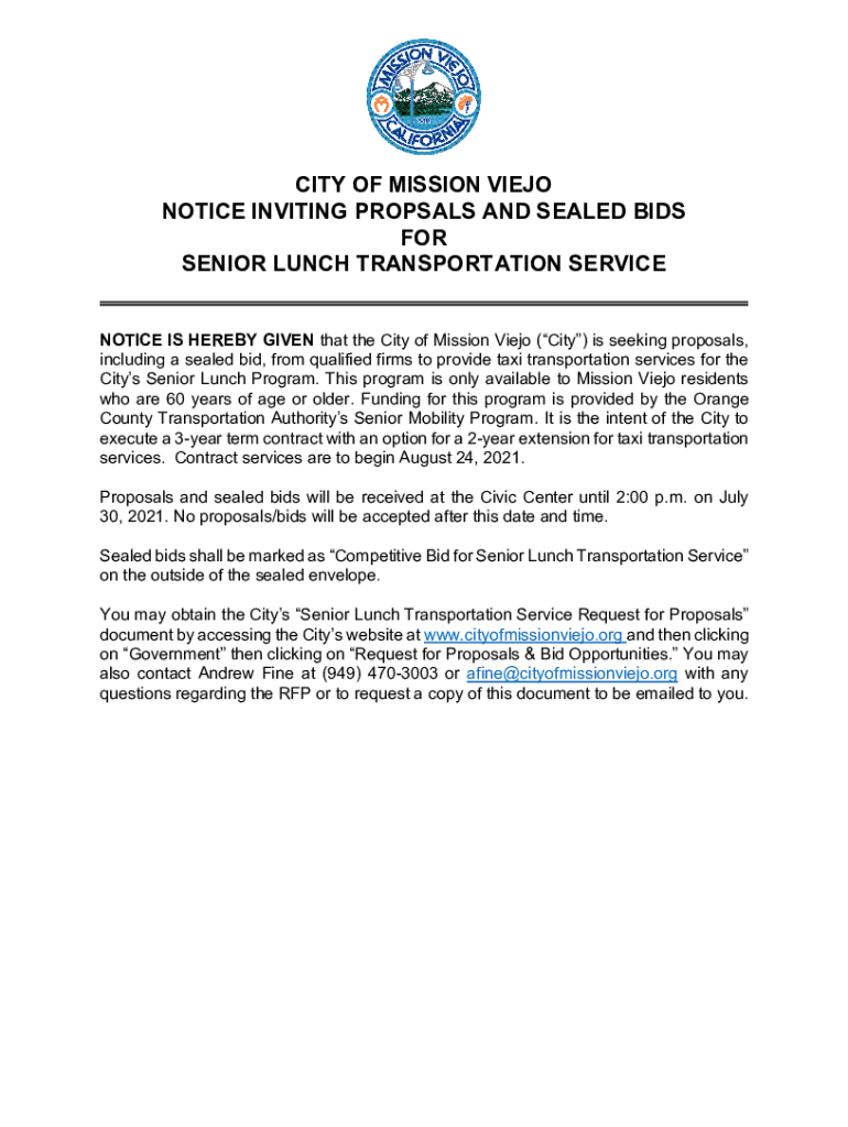 CITY OF MISSION VIEJO NOTICE INVITING PROPOSALS AND SEALED BIDS FOR SENIOR LUNCH TRANSPORTATION SERVICE NOTICE IS HEREBY GIVEN that the City of Mission Viejo (City) is seeking proposals, including
