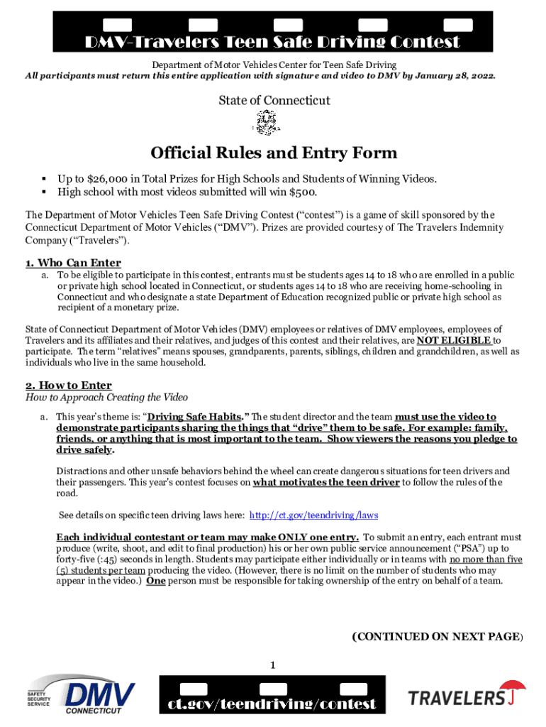 Department of Motor Vehicles Center for Teen Safe Driving participants must return this entire application with signature and video to DMV by January 28, 2022. State of ConnecticutOfficial Rules and