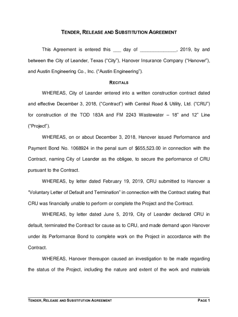 TENDER, RELEASE AND SUBSTITUTION AGREEMENT This Agreement is entered this day of, 2019, by and between the City of Leander, Texas (City), Hanover Insurance Company (Hanover), and Austin Engineering