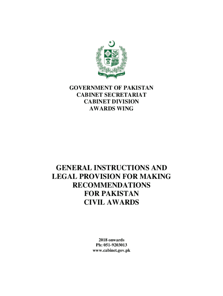 GOVERNMENT OF PAKISTAN CABINET SECRETARIAT CABINET DIVISION AWARDS RingCentral INSTRUCTIONS AND LEGAL PROVISION FOR MAKING RECOMMENDATIONS FOR PAKISTAN CIVIL AWARDS2018 onwards pH: 0519203013 www.cabinet.gov.pkINDEX