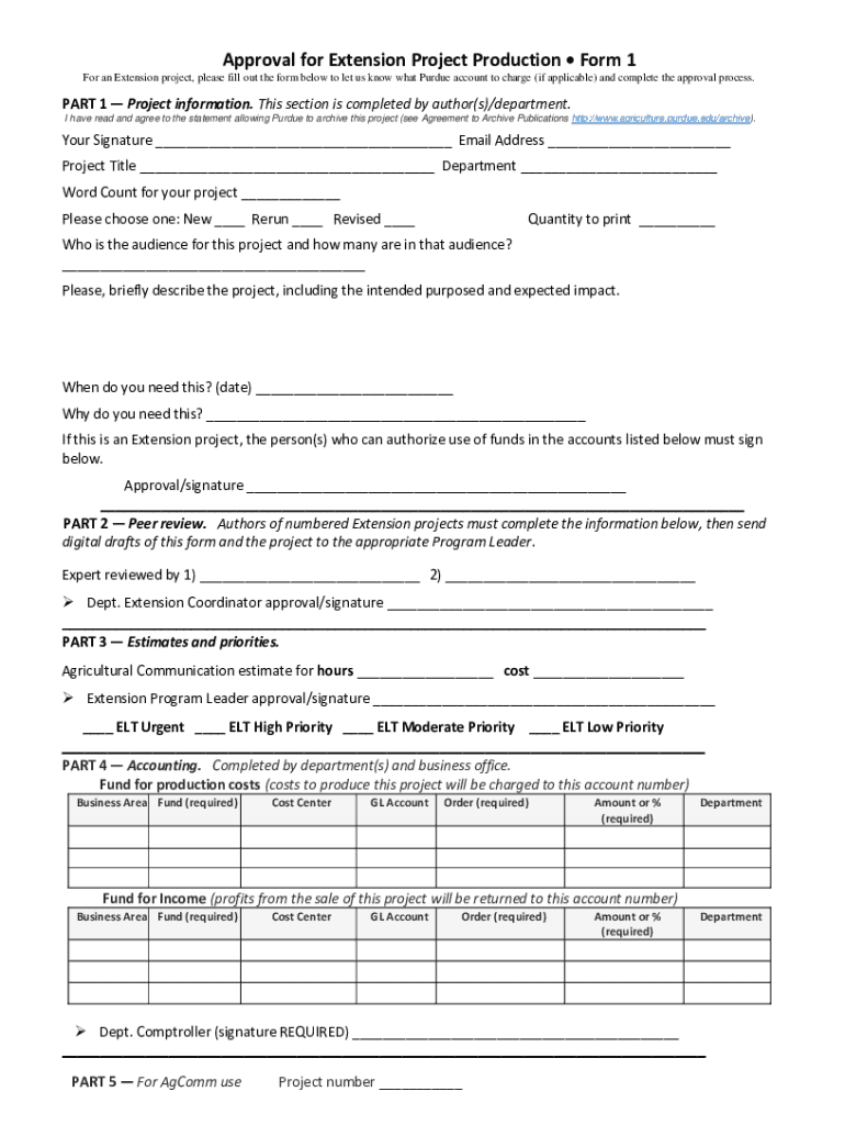 Approval for Extension Project Production Form 1 For an Extension project, please fill out the form below to let us know what Purdue account to charge (if applicable) and complete the approval process.