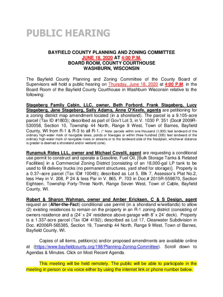 PUBLIC HEARING MAYFIELD COUNTY PLANNING AND ZONING COMMITTEE JUNE 18, 2020, AT 4:00 P.M. Boardroom, COUNTY COURTHOUSE WASHBURN, WISCONSIN The Bay field County Planning and Zoning Committee of the