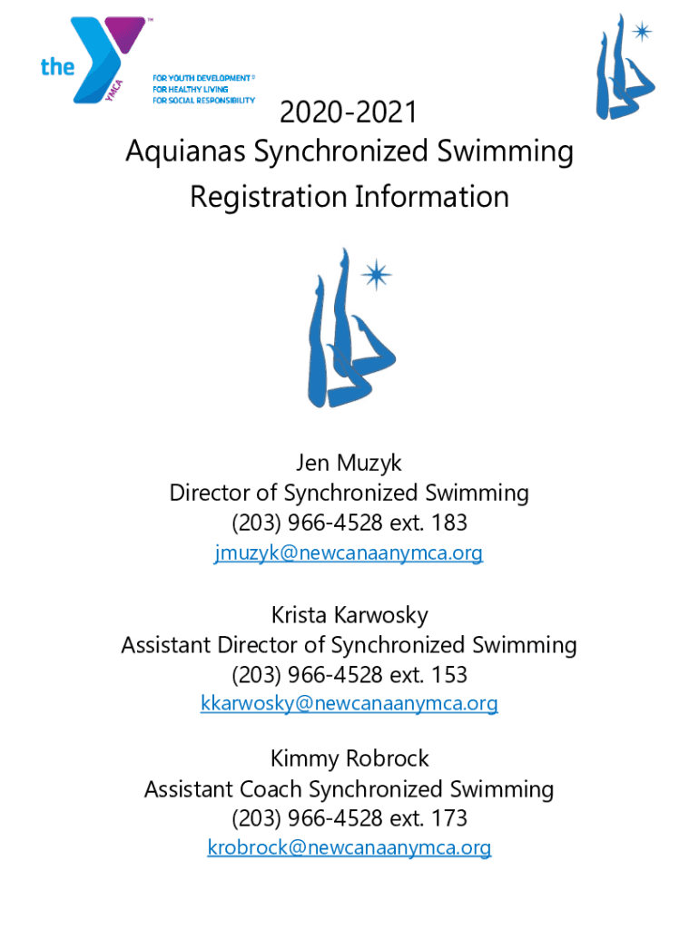 20202021 Aquinas Synchronized Swimming Registration Information Muzak Director of Synchronized Swimming (203) 9664528 ext. 183 jmuzyk@newcanaanymca.orgKrista Karaoke Assistant Director of Synchronized
