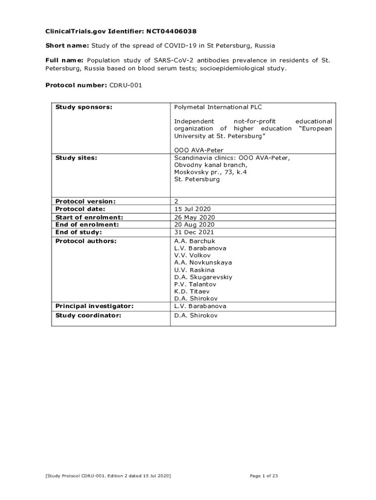 ClinicalTrials.gov Identifier: NCT04406038 Short name: Study of the spread of COVID-19 in St Petersburg, Russia Full name: Population study of SARSCoV2 antibodies prevalence in residents of St. Petersburg,