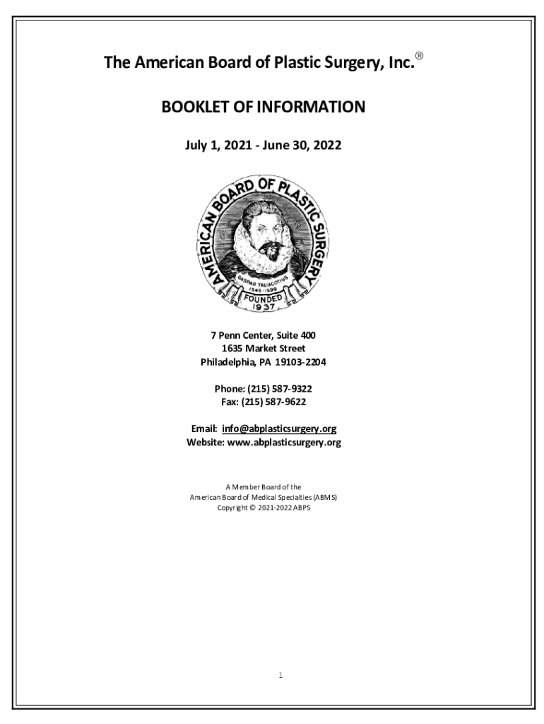 TheAmericanBoardofPlasticSurgery, Inc. BOOKLETOFINFORMATION July1,2021June30,2022 7PennCenter,Suite400 1635MarketStreet Philadelphia,PA191032204 Phone:(215)5879322 Fax:(215)5879622 Email:info@abplasticsurgery.org