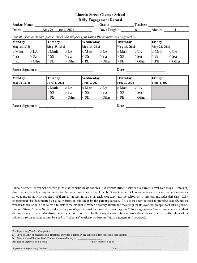 Get the free Lincoln Street Charter School Daily Engagement Record ...