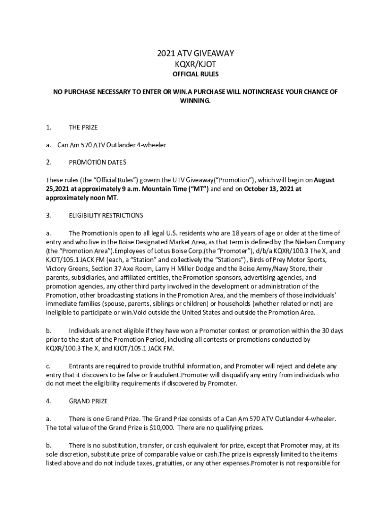 2021 ATV GIVEAWAY KERR/KNOT OFFICIAL RULES NO PURCHASE NECESSARY TO ENTER OR WIN. A PURCHASE WILL INCREASE YOUR CHANCE OF WINNING. 1.THE Prize. Can Am 570 ATV Outlander 4wheeler 2.PROMOTION Aesthete