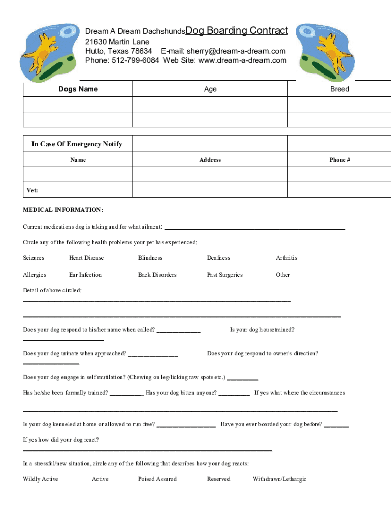 DreamADreamDachshundsDogBoardingContract 21630MartinLane Bhutto,Texas78634 Email:sherry dreamadream.com Phone:5127996084 Website:www.dreamadream.com Dominate AgeBreedInCaseOfEmergencyNotify NameAddressPhone#Vet: