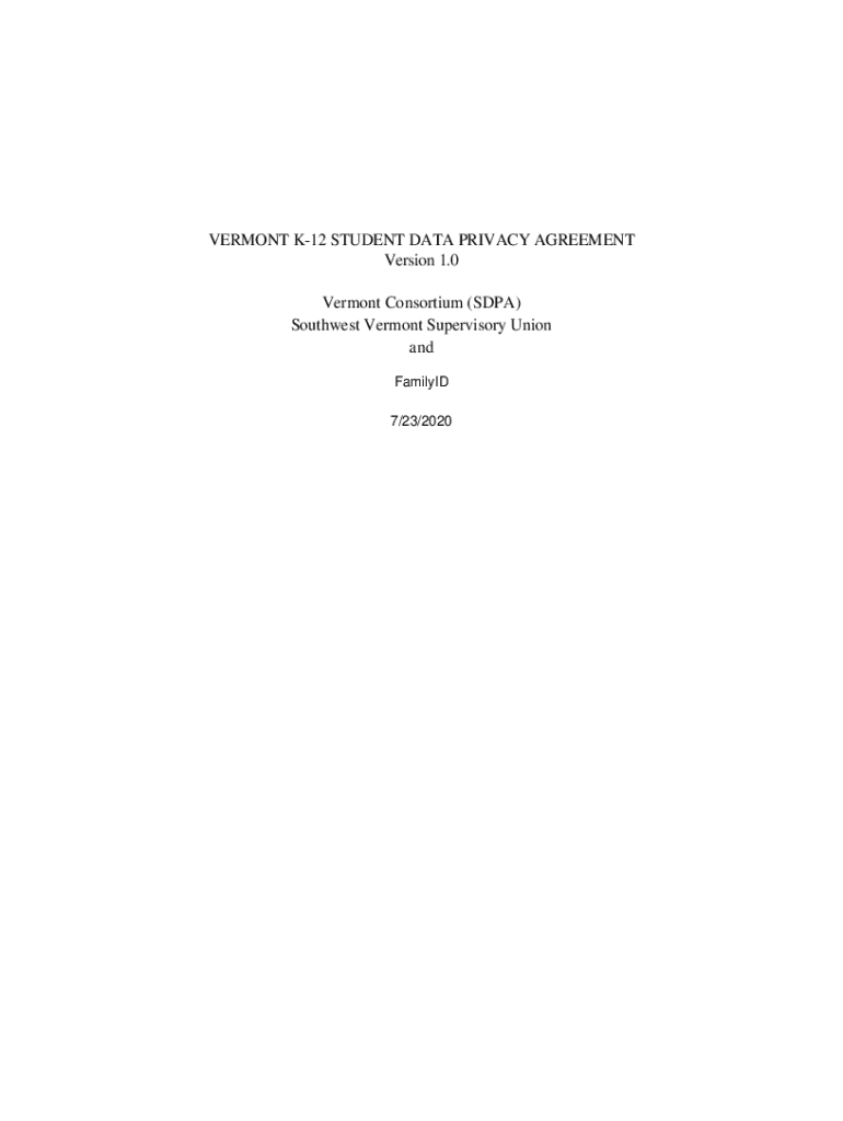 VERMONT K12 STUDENT DATA PRIVACY AGREEMENT Version 1.0 Vermont Consortium (SPA) Southwest Vermont Supervisory Union and Family ID 7/23/2020This Vermont Student Data Privacy Agreement (DPA “) is
