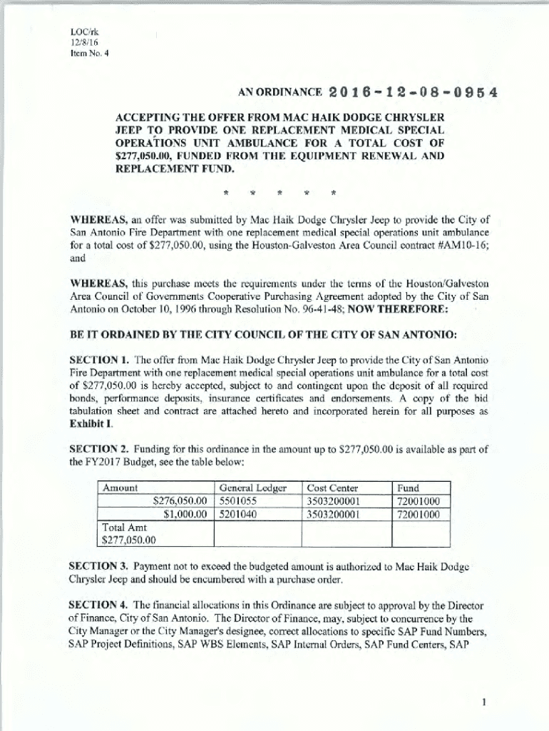 LOC/OK 12/811 6 Item No. 4AN ORDINANCE2 0 1 8. 1 2 0 8 0 9 5 4ACCEPTING THE OFFER FROM MACH AIK DODGE CHRYSLER JEEP TO. PROVIDE ONE REPLACEMENT MEDICAL SPECIAL OPERATIONS UNIT AMBULANCE FOR A TOTAL