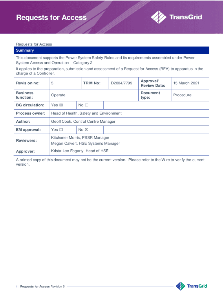 Requests for AccessRequests for Access Summary This document supports the Power System Safety Rules and its requirements assembled under Power System Access and Operation Category 2. It applies to