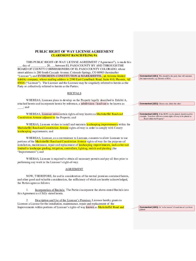 PUBLIC RIGHT OF WAY LICENSE AGREEMENT CLAREMONT RANCH FILING 9A THIS PUBLIC RIGHTOFWAY LICENSE AGREEMENT (Agreement), is made this day of, 20, between EL PASO COUNTY BY AND THROUGH THE BOARD OF COUNTY