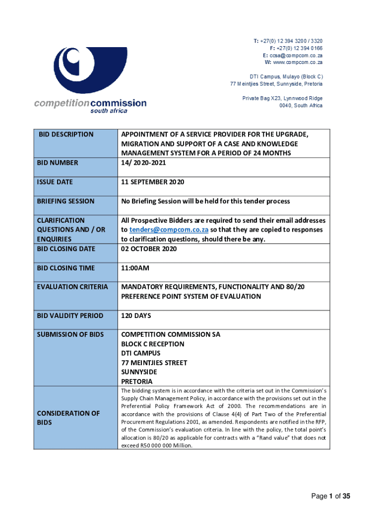 BID DESCRIPTION BID NUMBERAPPOINTMENT OF A SERVICE PROVIDER FOR THE UPGRADE, MIGRATION AND SUPPORT OF A CASE AND KNOWLEDGE MANAGEMENT SYSTEM FOR A PERIOD OF 24 MONTHS 14/ 20202021ISSUE DATE11 SEPTEMBER