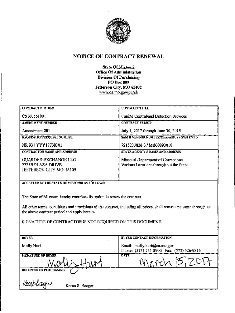 NOTICE OF CONTRACT RENEWAL State Of Missouri Office Of Administration Division Of Purchasing POBox809 Jefferson City, MO 65102 www.oa.mo.gov/purchCONTRACT NUI\'PRE-CONTRACT TITLECS160551001Canine