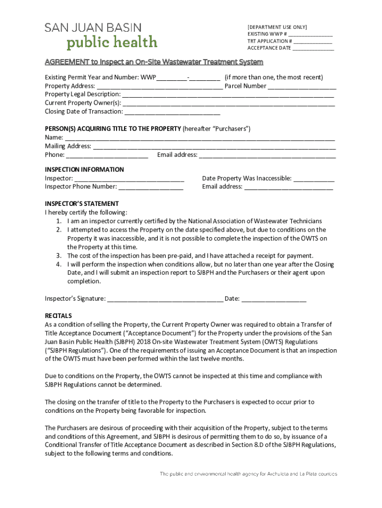 DEPARTMENT USE ONLY EXISTING WWF # TRT APPLICATION # ACCEPTANCE DATE AGREEMENT to Inspect an Onsite Wastewater Treatment System Existing Permit Year and Number: WWF (if more than one, the most recent)