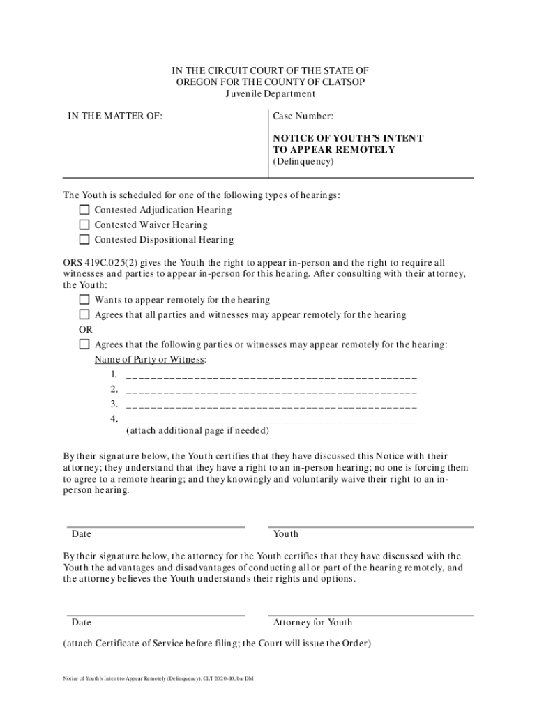IN THE CIRCUIT COURT OF THE STATE OF OREGON FOR THE COUNTY OF CLASP Juvenile Department IN THE MATTER OF:Case Number: NOTICE OF YOUTHS INTENT TO APPEAR REMOTELY (Delinquency)The Youth is scheduled