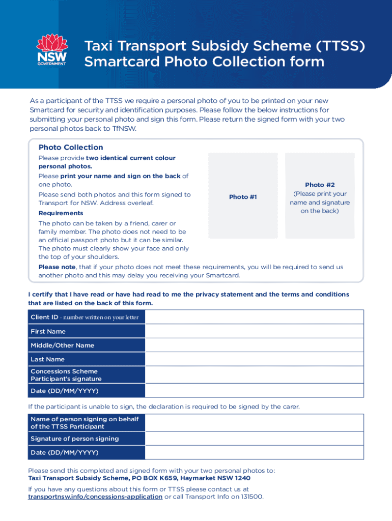 Taxi Transport Subsidy Scheme (TOSS) Smart card Photo Collection form As a participant of the TOSS we require a personal photo of you to be printed on your new Smart card for security and identification