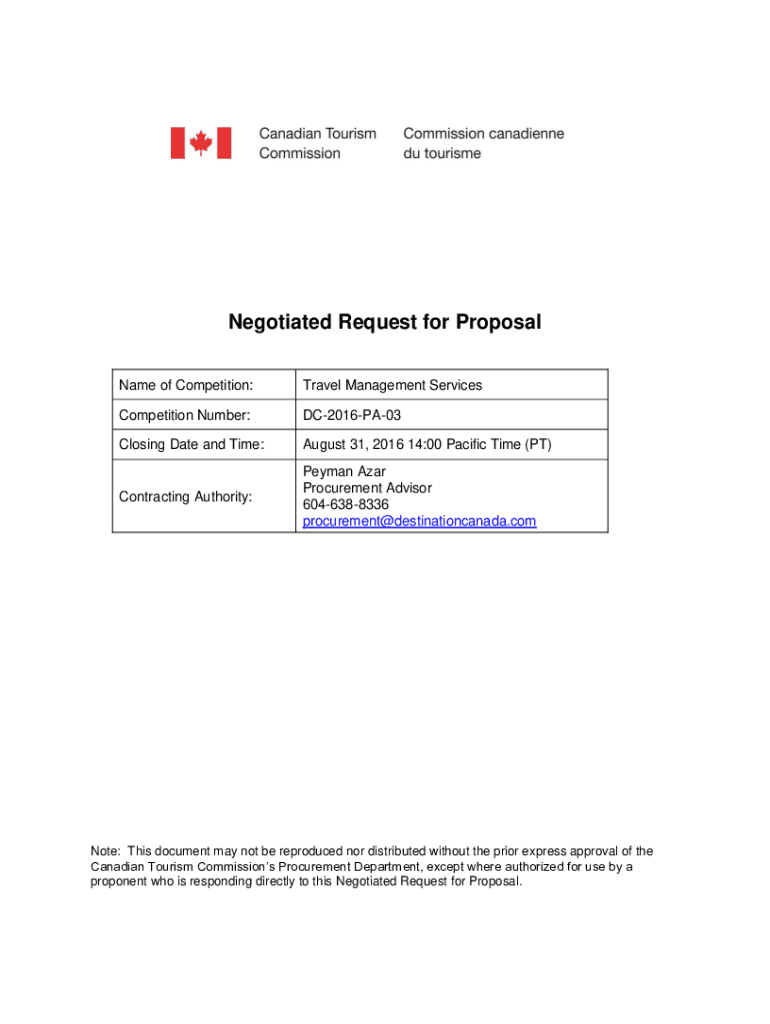 Negotiated Request for Proposal Name of Competition:Travel Management ServicesCompetition Number:DC2016PA03Closing Date and Time:August 31, 2016 14:00 Pacific Time (PT)Contracting Authority:Pagan