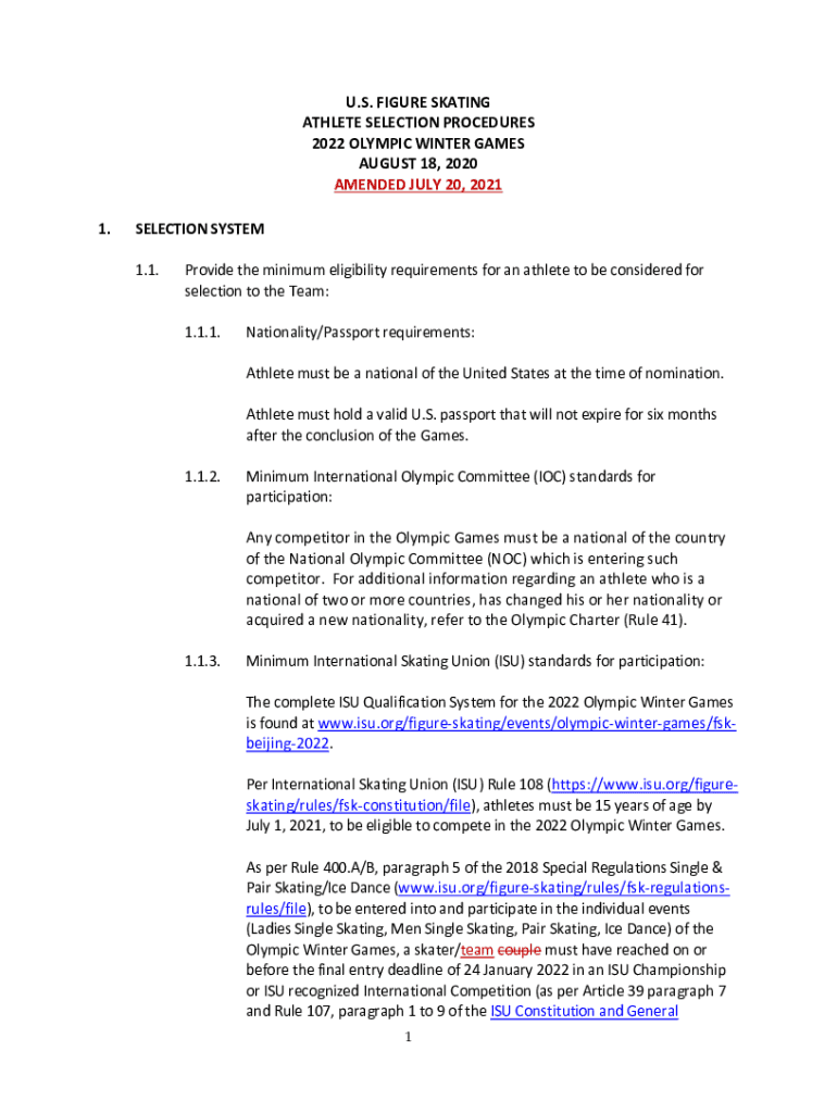 U.S. FIGURE SKATING ATHLETE SELECTION PROCEDURES 2022 OLYMPIC WINTER GAMES AUGUST 18, 2020, AMENDED JULY 20, 2021 1.SELECTION SYSTEM 1.1. Provide the minimum eligibility requirements for an athlete
