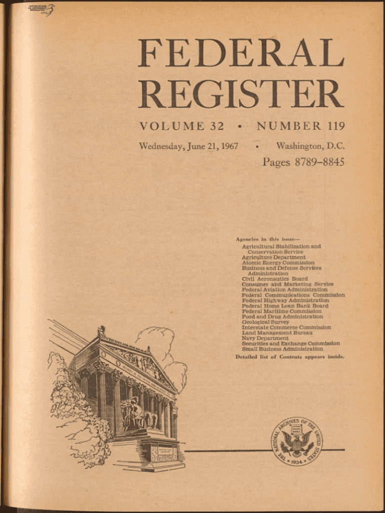 FEDERAL REGISTER V O L U M E 32Wednesday, June 21, 1967, N U M B E R 119 Washington, D.C. Pages 87898845Agencies in this issueAgricultural Stabilization and Conservation Service Agriculture Department