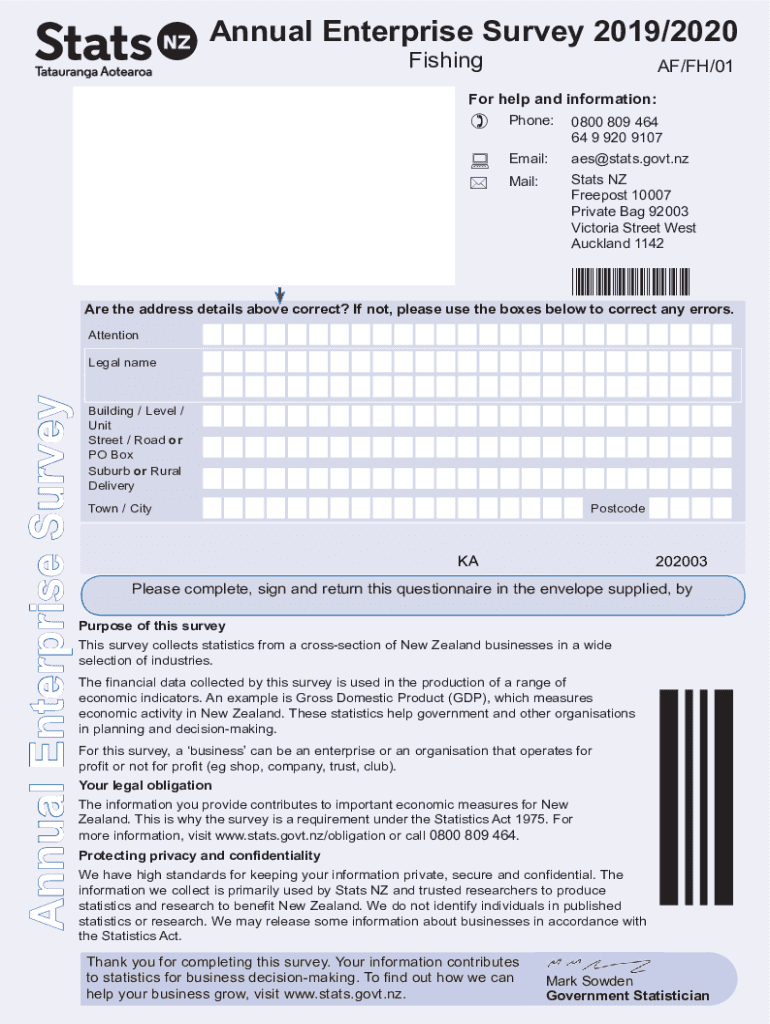 Annual Enterprise Survey 2019/2020 Fishing AF/FH/01For help and information:Phone:0800 809 464 64 9 920 9107Email:assistants.govt.email:Stats NZ Free post 10007 Private Bag 92003 Victoria Street West
