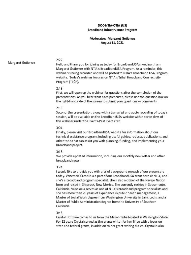 DOCNTIAOTIA (US) Broadband Infrastructure Program Moderator: Margaret Gutierrez August 11, 2021Margaret Gutierrez2:22 Hello and thank you for joining us today for Broadband USA\'s webinar. I am Margaret