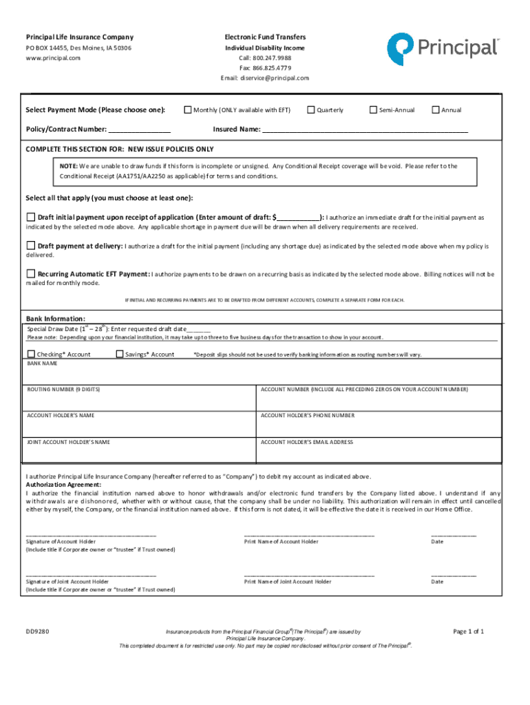 PrincipalLifeInsuranceCompanyElectronicFundTransfersPOBOX14455,Des Moines,IA50306 www.principal.com IndividualDisabilityIncome Call:800.247.9988 Fax:866.825.4779 Email:disservice principal.com SelectPaymentMode(Pleasechooseone):Policy/ContractNumber: