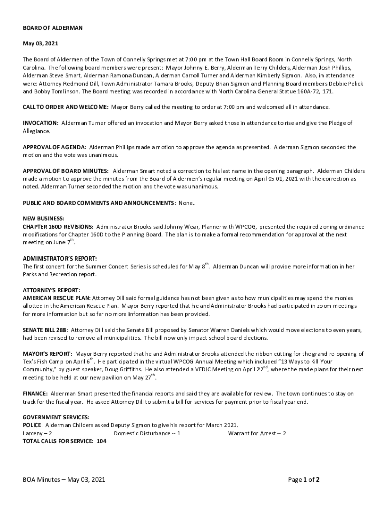 BOARD OF ALDERMAN May 03, 2021, The Board of Aldermen of the Town of Connelly Springs met at 7:00 pm at the Town Hall Board Room in Connelly Springs, North Carolina. The following board members were