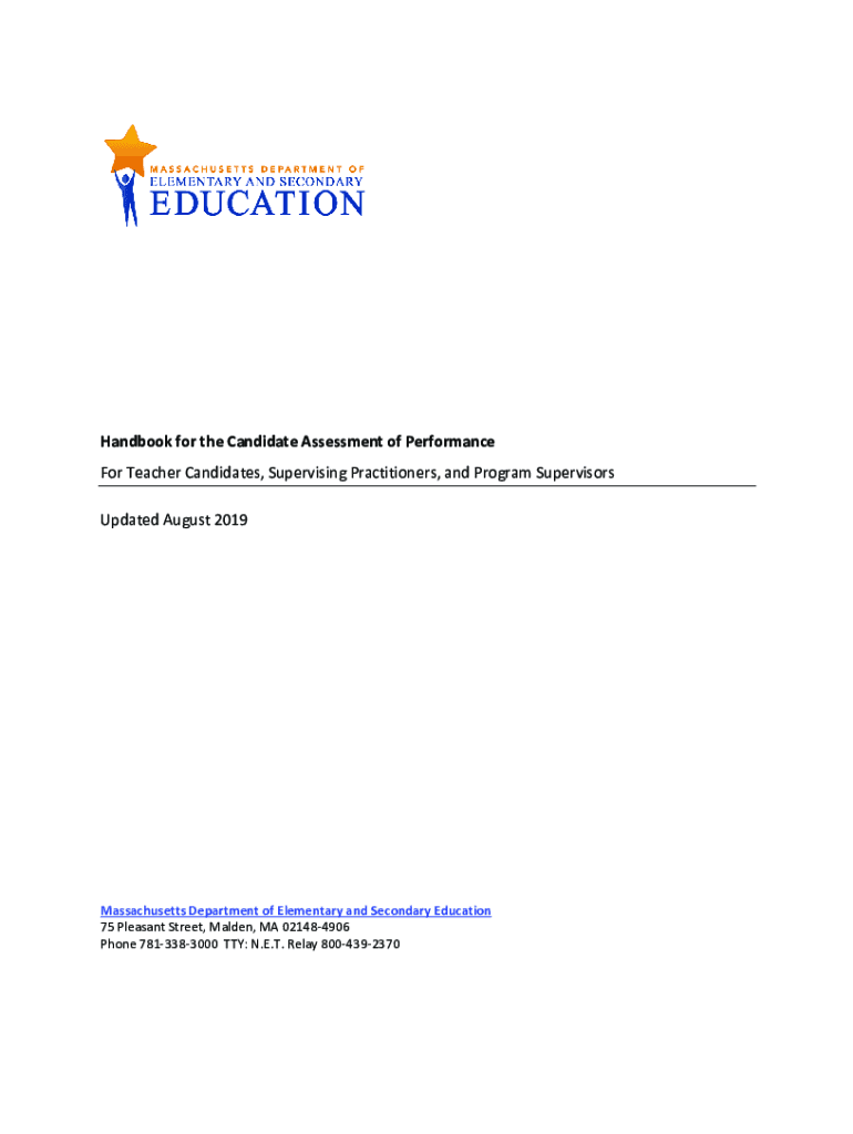 Handbook for the Candidate Assessment of Performance For Teacher Candidates, Supervising Practitioners, and Program Supervisors Updated August 2019Massachusetts Department of Elementary and Secondary