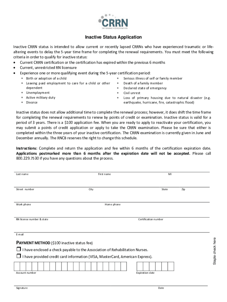 Inactive Status Application Inactive CORN status is intended to allow current or recently lapsed Corns who have experienced traumatic or life altering events to delay the 5year time frame for completing