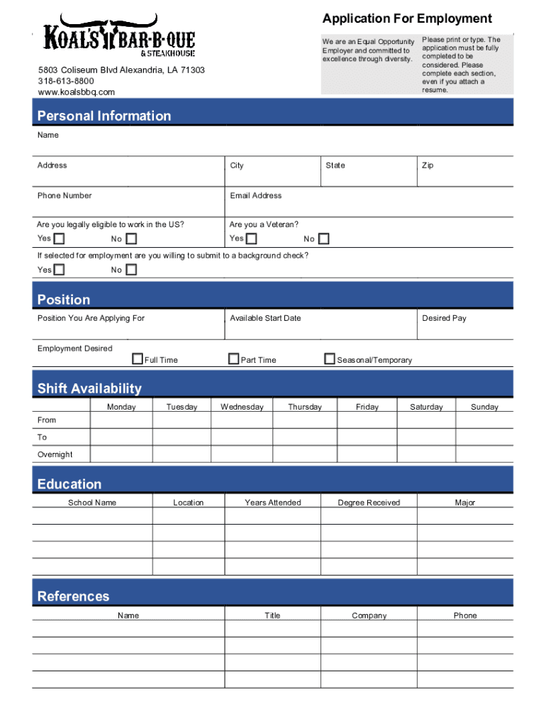 Application For Employment We are an Equal Opportunity Employer and committed to excellence through diversity.5803 Coliseum Blvd Alexandria, LA 71303 3186138800 www.koalsbbq.comPlease print or type.