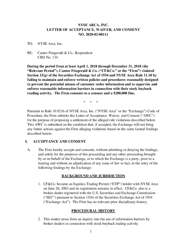 Get the free NYSE ARCA, INC. LETTER OF ACCEPTANCE, WAIVER, AND CONSENT ...