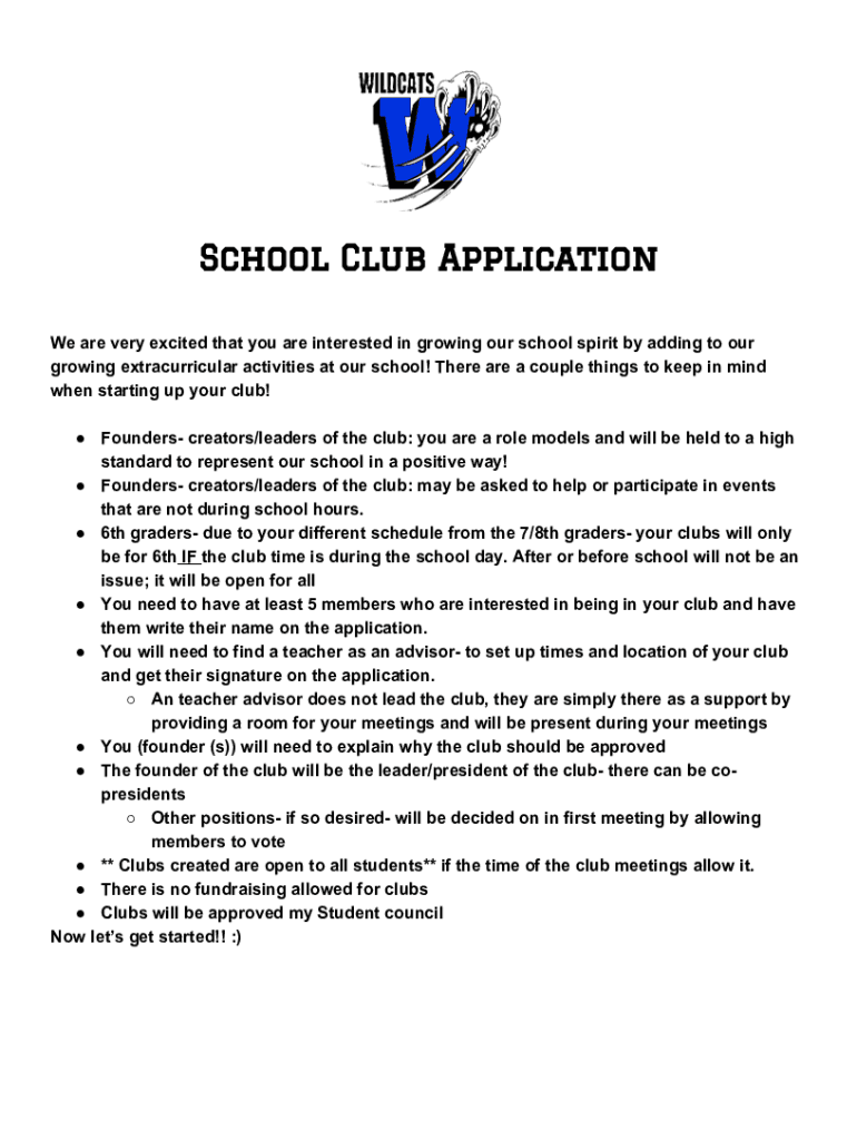 School Club Application We are very excited that you are interested in growing our school spirit by adding to our growing extracurricular activities at our school! There are a couple of things to