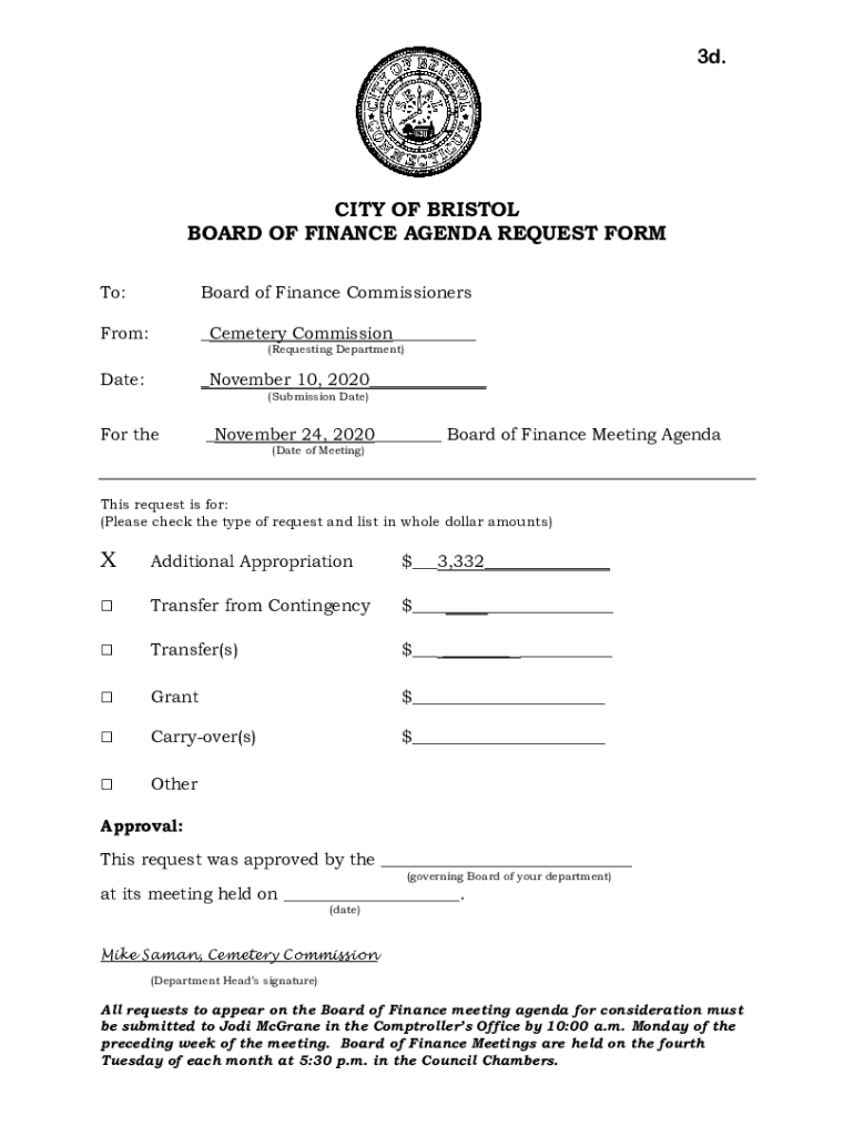 3d.CITY OF BRISTOL BOARD OF FINANCE AGENDA REQUEST FORM To:Board of Finance CommissionersFrom: Cemetery Commission (Requesting Department)Date: November 10, 2020 (Submission Date)For the November