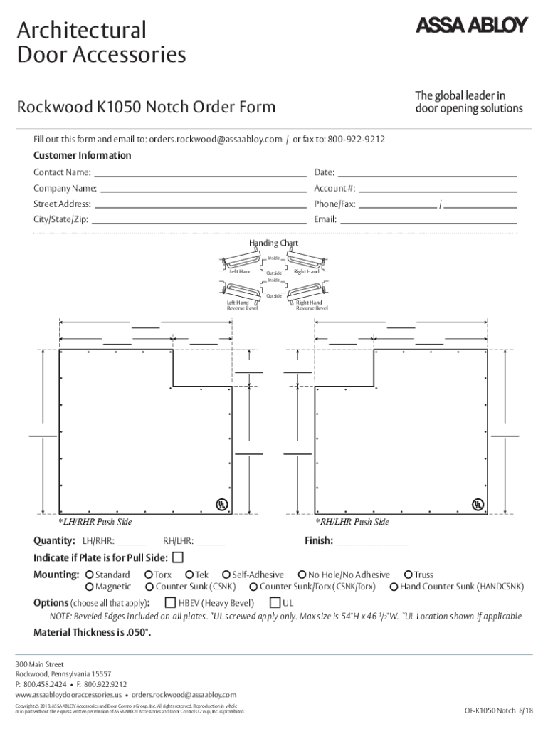 Architectural Door Accessories Lockwood K1050 Notch Order Form Fills out this form and email to: orders.rockwood@assaabloy.com / or fax to: 8009229212Customer Information Contact Name:Date:Company