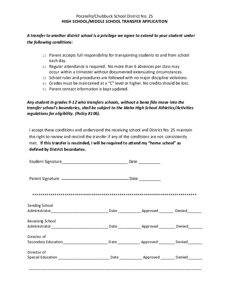 Pocatello/Chub buck School District No. 25 HIGH SCHOOL/MIDDLE SCHOOL TRANSFER APPLICATION A transfer to another district school is a privilege we agree to extend to your student under the following