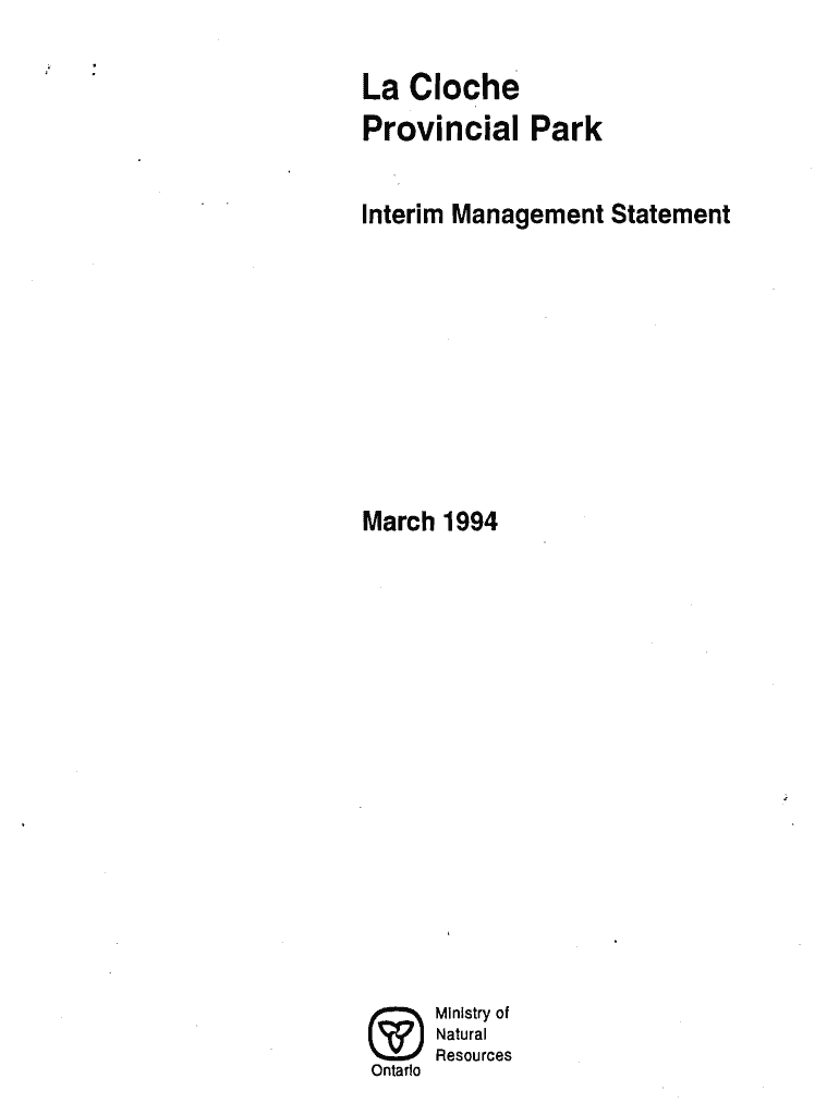 , La Cloche Provincial Park Interim Management Statement March 1994 W Ontario Ministry of Natural Resources co 1994 Queen's Printer for Ontario Printed in Ontario, Canada Additional information about