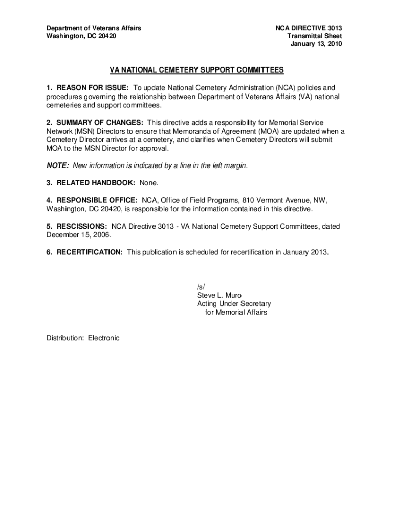 Department of Veterans Affairs Washington, DC 20420NCA DIRECTIVE 3013 Transmittal Sheet January 13, 2010VA NATIONAL CEMETERY SUPPORT COMMITTEES 1. REASON FOR ISSUE: To update National Cemetery Administration
