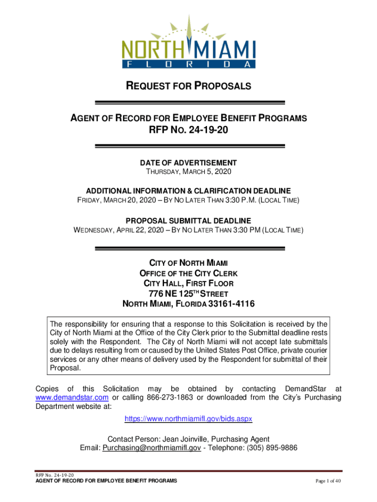 REQUEST FOR PROPOSALS AGENT OF RECORD FOR EMPLOYEE BENEFIT PROGRAMS RFP NO. 241920 DATE OF ADVERTISEMENT THURSDAY, MARCH 5, 2020, ADDITIONAL INFORMATION & CLARIFICATION DEADLINE FRIDAY, MARCH 20,