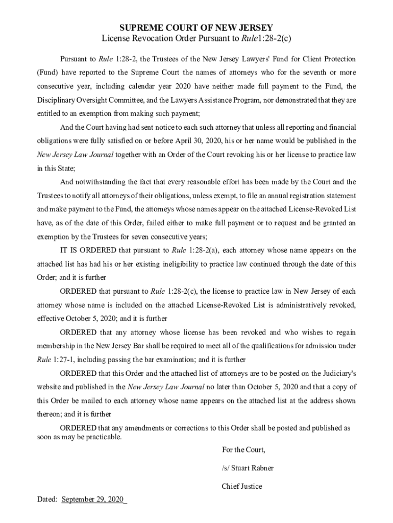 SUPREME COURT OF NEW JERSEY License Revocation Order Pursuant to Rule1:282 Pursuant to Rule 1:282, the Trustees of the New Jersey Lawyers Fund for Client Protection (Fund) have reported to the Supreme