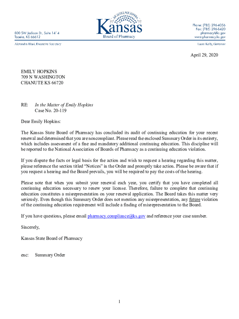 April 29, 2020, EMILY HOPKINS 709 N WASHINGTON CANUTE KS 66720RE:In the Matter of Emily Hopkins Case No. 20119Dear Emily Hopkins: The Kansas State Board of Pharmacy has concluded its audit of continuing