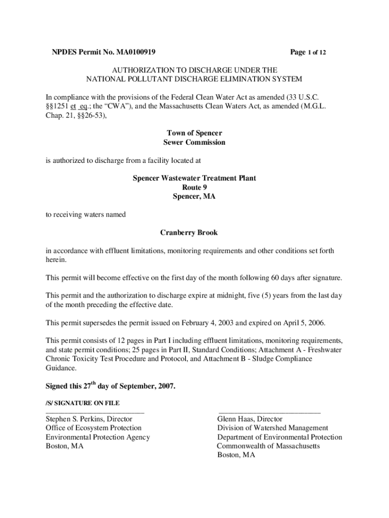 Get the free NPDES Permit No. MA0101061 Page 1 of 11 AUTHORIZATION TO ...
