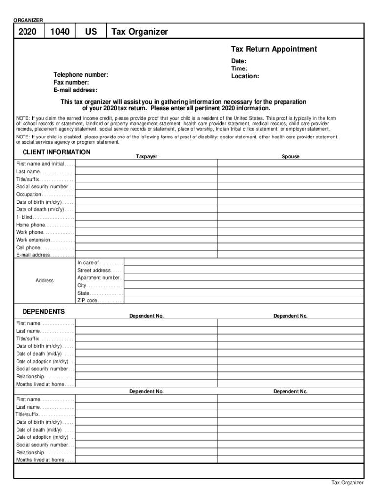 ORGANIZER20201040USTax Organizer Tax Return Appointment Date: Time: Location:Telephone number: Fax number: Email address:This tax organizer will assist you in gathering information necessary for the