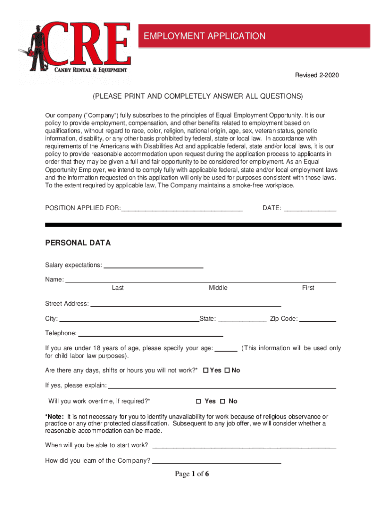 EMPLOYMENT APPLICATIONRevised 22020(PLEASE PRINT AND COMPLETELY ANSWER ALL QUESTIONS) Our company (Company) fully subscribes to the principles of Equal Employment Opportunity. It is our policy to
