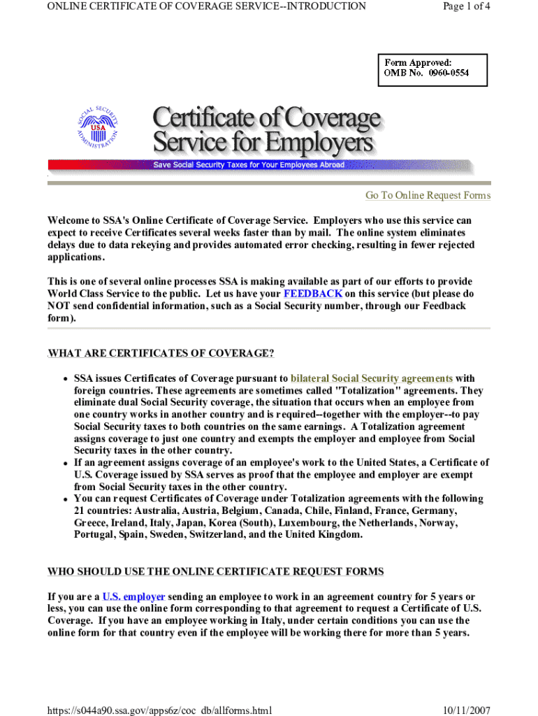 ONLINE CERTIFICATE OF COVERAGE SERVICEINTRODUCTIONPage 1 of 4Go To Online Request Forms Welcome to SSA\'s Online Certificate of Coverage Service. Employers who use this service can expect to receive