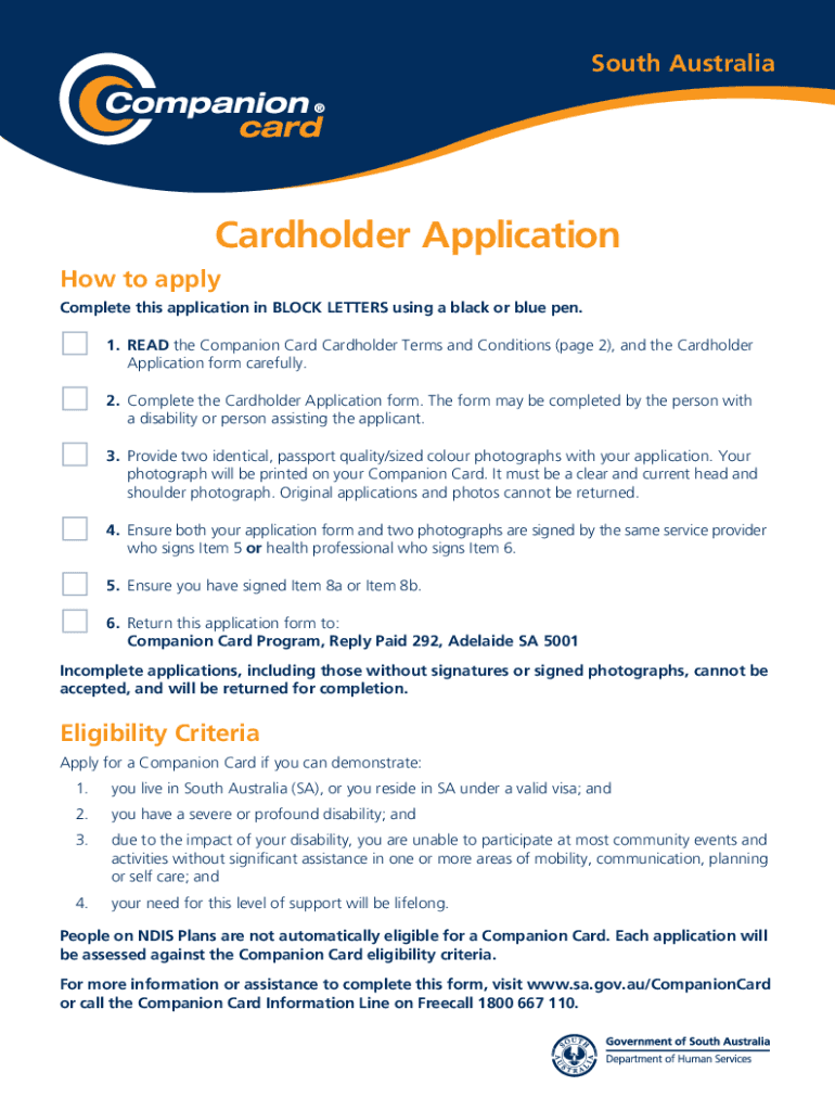 South AustraliaCardholder Application How to apply Complete this application in BLOCK LETTERS using a black or blue pen. 1. READ the Companion Card Cardholder Terms and Conditions (page 2), and the