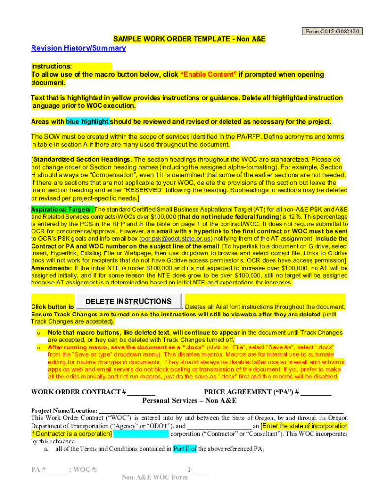 SAMPLE WORK ORDER TEMPLATE Non Reform C015G082420Revision History/SummaryInstructions: To allow use of the macro button below, click Enable Content if prompted when opening document. Text that is