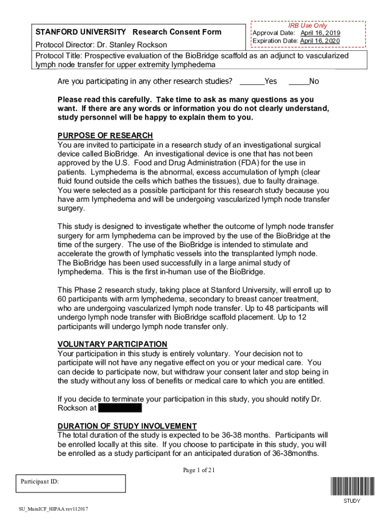 STANFORD UNIVERSITY Research Consent Form IRB Use Only Approval Date: April 16, 2019, Expiration Date: April 16, 2020Protocol Director: Dr. Stanley Rock son Protocol Title: Prospective evaluation