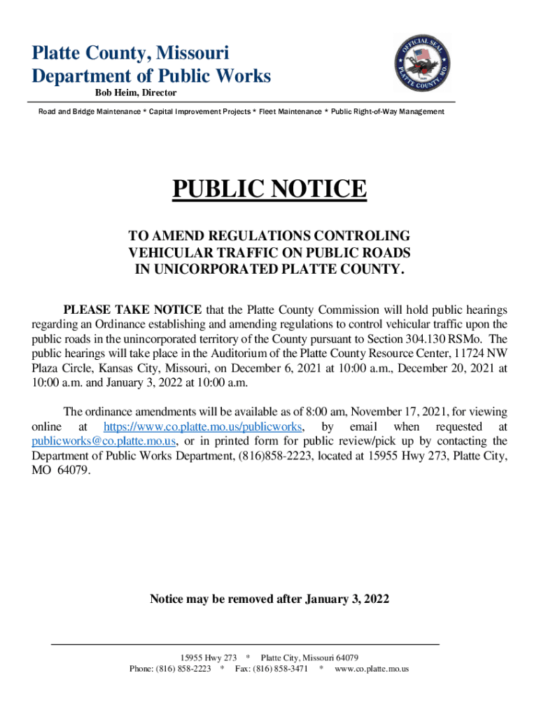 Platte County, Missouri Department of Public Works Bob Ham, Director Road and Bridge Maintenance * Capital Improvement Projects * Fleet Maintenance * Public RightofWay ManagementPUBLIC NOTICE TO AMEND