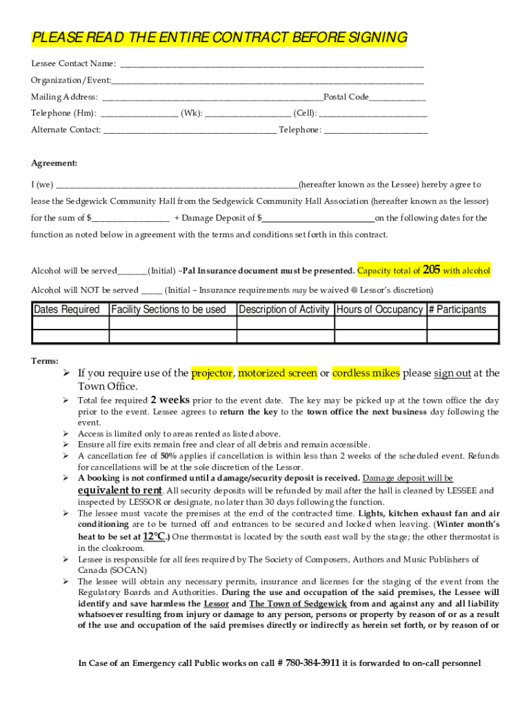 PLEASE READ THE ENTIRE CONTRACT BEFORE SIGNING Lessee Contact Name: Organization/Event: Mailing Address: Postal Code Telephone (Hm): (Wk): (Cell): Alternate Contact: Telephone: Agreement: I (we) (hereafter